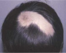 斑秃初起为1个或数个边界清楚的圆形或椭圆形脱发区,直径约1~2cm更大。脱发区的边缘处常有一些松而易脱的头发,有的已经折断,近侧端的毛往往萎缩。脱发现象继续增多,每片亦扩展,可互相融合形成不规则形。如继续进展可以全秃。严重者眉毛、睫毛、腋毛、阴毛和全身毳毛也都脱落,即为普秃。