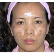 1、皮损为淡褐色或黄褐色斑,边界较清,形状不规则,对称分布于眼眶附近、额部、眉弓、鼻部、两颊、唇及口周等处,无自觉症状及全身不适。