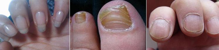 远侧端甲下型灰指甲初表现为甲的远端(侧缘)甲板面出现不规则的小片白斑,随后变成无光泽的灰斑,并逐渐变为黄棕色直至黑色。不久甲板变质,甲下角质碎屑堆积、甲床增厚。之后甲板变萎缩,偶有出血。