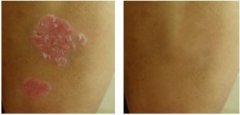 3、巩固期,约85-115天。重度患者鳞屑成片脱落,色素消退。红皮型、脓胞型、关节型牛皮癣在此阶段获得。肌肤润泽,有弹性。皮肤和正常人一样。