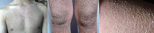 鱼鳞病的主要表现为四肢伸侧或躯干部皮肤干燥、粗糙,伴有菱形或多角形鳞屑,外观如鱼鳞状或蛇皮状,重者皮肤皲裂、表皮僵硬、导致自身汗毛稀少、排汗异常,致使体内水液代谢失衡,影响内分泌系统。