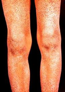 二、先天性鱼鳞病的并发损害:指甲、毛发发育不良,且质地松脆,指、趾拳曲不能动等;轻症者角化层较薄,呈棕红色或淡红色,反复剥脱可延至数月,终局限于四肢伸侧;重症多因不能吮奶或继发感染而死亡。